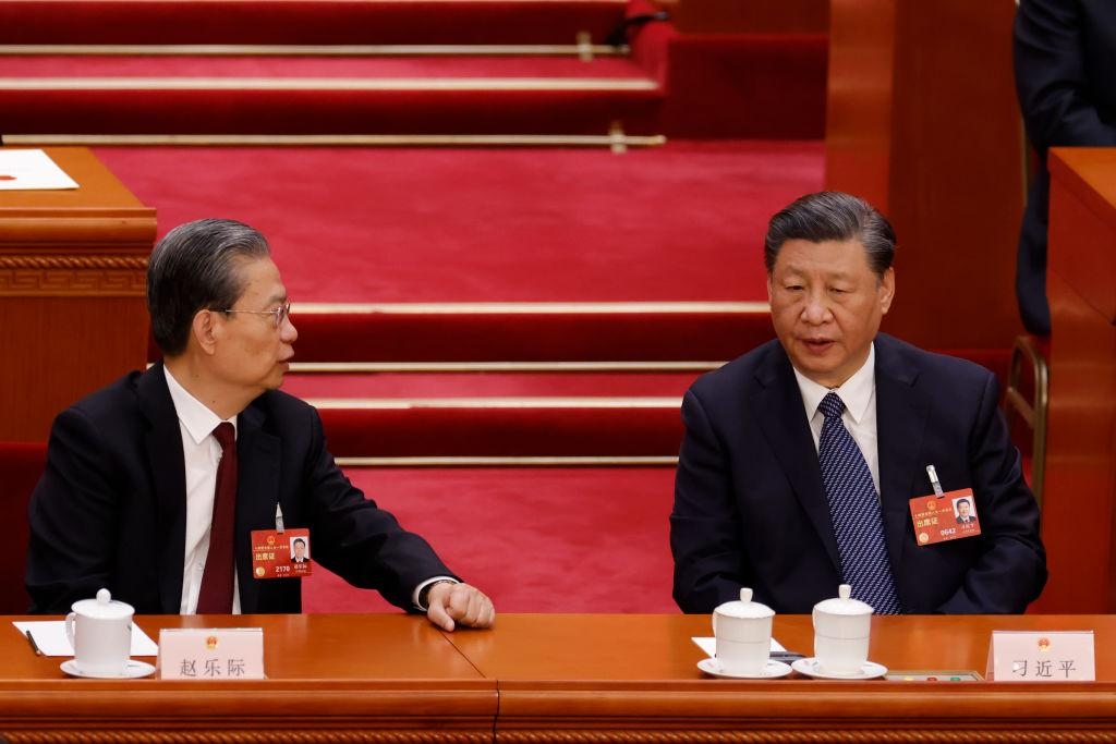 El líder chino Xi Jinping habla con el presidente de la Asamblea Popular Nacional, Zhao Leji, durante la quinta sesión plenaria de la Asamblea Popular Nacional, el órgano legislativo chino, en Beijing, el 12 de marzo de 2023. (Lintao Zhang/Getty Images)Este juramento de lealtad, excesivo y guionizado, contrastaba fuertemente con la postura pública de Zhang durante el último año, en el que siempre había hecho hincapié en el "liderazgo colectivo" dentro del ejército, lo que suponía un desafío implícito a la autoridad individual de Xi. El cambio repentino a elogios entusiastas hacia Xi sugiere que la influencia de Zhang ya se estaba debilitando y que intentaba desesperadamente salvaguardar su posición.