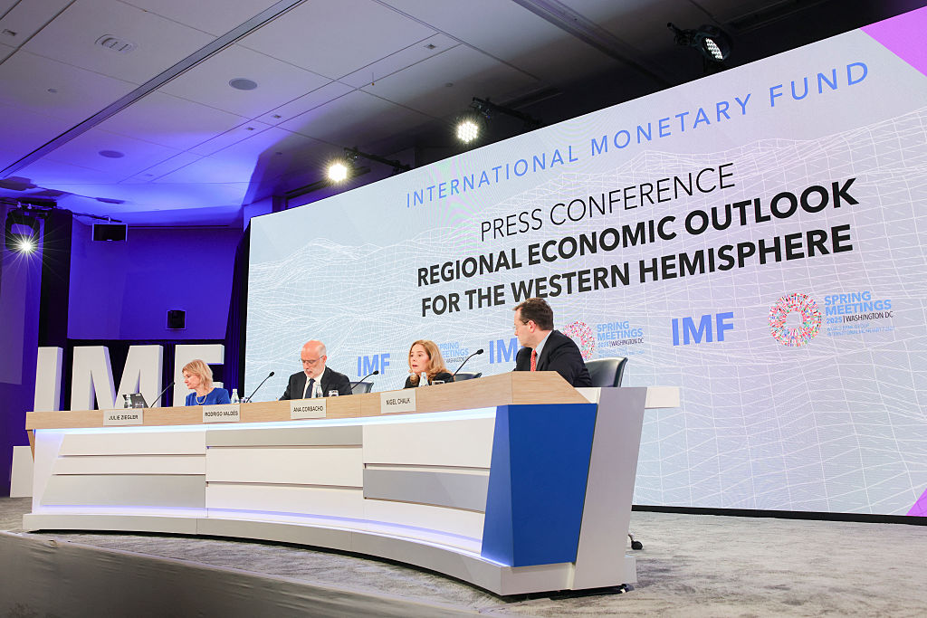 Ana Corbacho, Subdirectora del Departamento del Hemisferio Occidental del FMI (segunda desde la derecha), habla junto a (de izq. a der.) Julie Ziegler, Oficial Superior de Comunicaciones del FMI; Rodrigo Valdés, Director del Departamento del Hemisferio Occidental del FMI; y Nigel Chalk, Subdirector del Departamento del Hemisferio Occidental del FMI, durante una conferencia de prensa titulada "Perspectivas económicas regionales para el hemisferio occidental" en las Reuniones de Primavera de 2025 del Grupo Banco Mundial (GBM) y el Fondo Monetario Internacional (FMI) en Washington, D.C., el 25 de abril de 2025. (Foto de BRYAN DOZIER/Middle East Images/AFP vía Getty Images)6. Taiwán y la presión indirecta