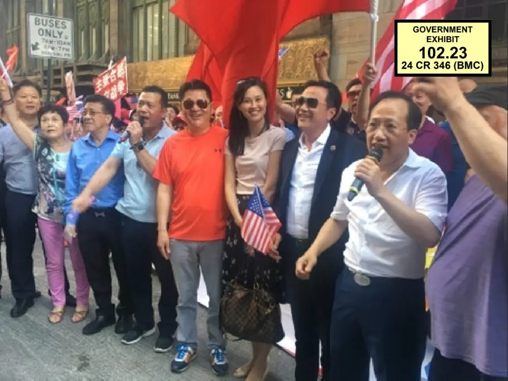 Linda Sun (C) se une a una protesta contra la visita de la presidenta taiwanesa Tsai Ing-wen, en Manhattan, Nueva York, el 12 de julio de 2019. Liang Guanjun (2.º por la derecha), presidente de las Asociaciones Chinas Unidas del Este de Estados Unidos, sostiene el micrófono. (Fiscalía de Estados Unidos)El actual proceso judicial contra Linda Sun, que fue jefa de gabinete adjunta de los sucesivos gobernadores de Nueva York Andrew Cuomo y Kathy Hochul, podría ser otro ejemplo de la UFWD en acción. Se le acusa de ser una agente china que utilizó su cargo para promover los intereses de Beijing, en particular socavando las relaciones con Taiwán y evitando el escrutinio de los abusos contra los derechos humanos cometidos por Beijing.