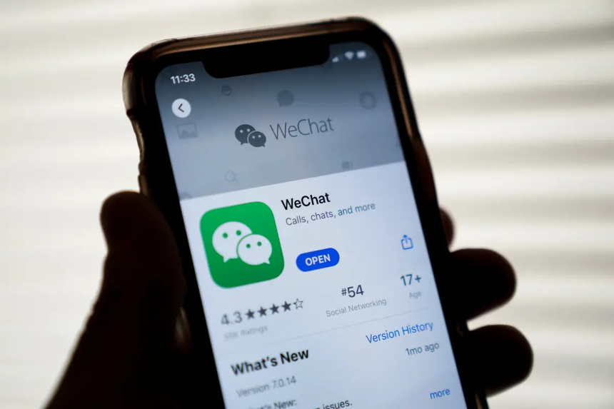 La aplicación WeChat se muestra en la App Store en un iPhone de Apple, en Washington, el 7 de agosto de 2020. (Drew Angerer/Getty Images)Una directiva interna filtrada a los medios de comunicación chinos durante la guerra entre Rusia y Ucrania ordenaba a los editores no publicar nada "desfavorable a Rusia y prooccidental" y utilizar únicamente hashtags de Xinhua, el Diario del Pueblo o la CCTV. Parece que se aplica un patrón similar también al conflicto con Irán.