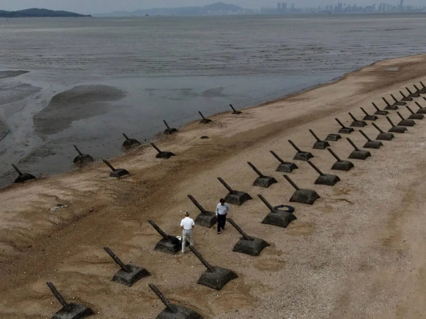 Turistas visitando las púas antidesembarco en la costa de Kinmen, las islas de primera línea de Taiwán, el 20 de octubre de 2020. (Sam Yeh/AFP vía Getty Images)En esencia, ante un agresor mucho más poderoso, cualquier cosa que no sea la rendición se consideraría una victoria.