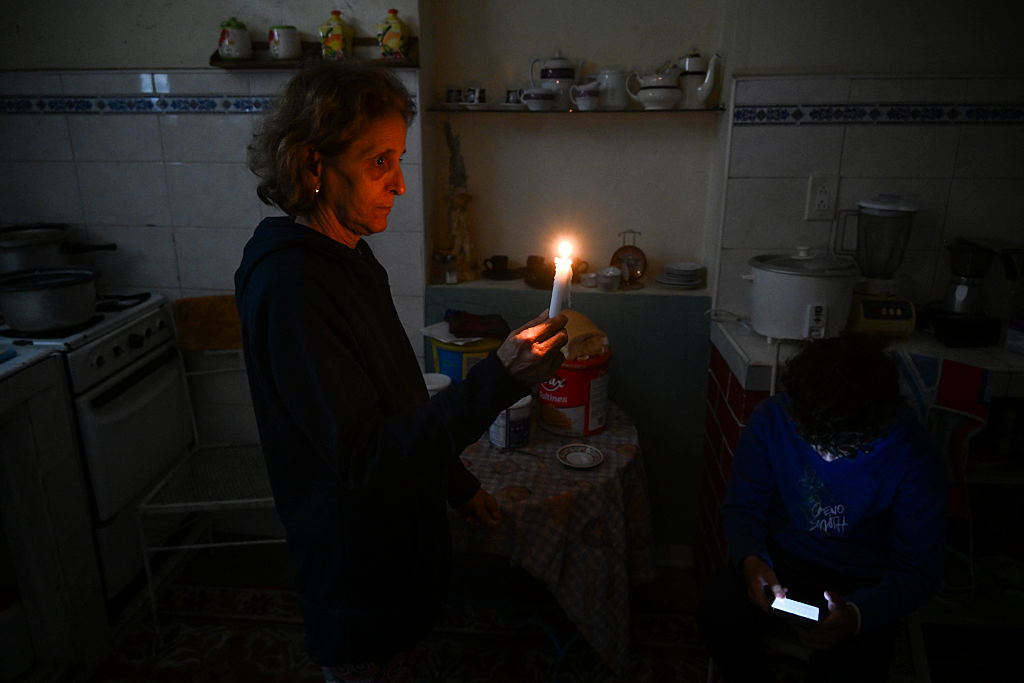 Una mujer sostiene una vela mientras un niño revisa su celular durante un apagón en el barrio de Luyano, La Habana, el 28 de enero de 2026. (Foto de YAMIL LAGE / AFP vía Getty Images)El giro hemisférico de Washington