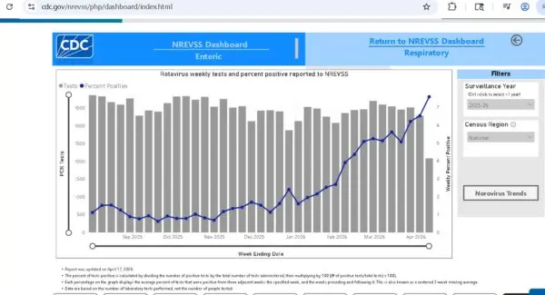 Los datos de la herramienta en línea WastewaterScan también muestran que la actividad del rotavirus es elevada en todo el país y ha ido aumentando de forma continua desde enero. Describió la actividad del virus como "alta".