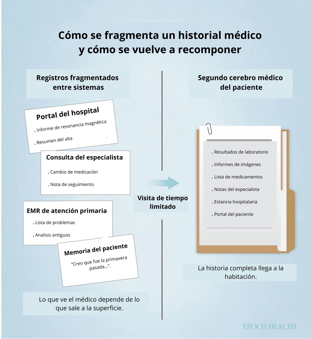 Historial médico fragmentado versus resumen médico del paciente. (Ilustración de The Epoch Times).¿Por qué necesita un segundo cerebro médico?