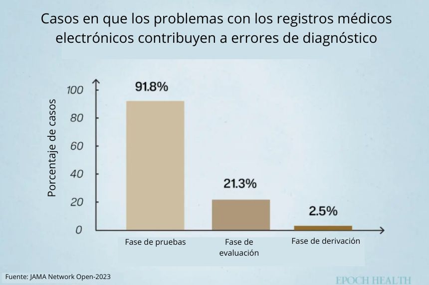 Los porcentajes reflejan etapas superpuestas; casos individuales pueden presentar múltiples etapas de error diagnóstico. (Ilustración de The Epoch Times).La falta de coincidencia en los registros médicos traslada silenciosamente la carga de la continuidad a los pacientes. Se espera que estos recuerden, concilien y repitan su historial y que conozcan su expediente lo suficientemente bien como para detectar los errores cuando surjan.