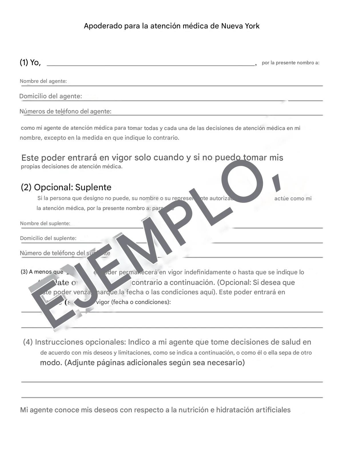 Un representante para la atención médica, a veces llamado poder notarial duradero para la atención médica, designa a la persona que puede decidir cuándo usted no puede. Le otorga autoridad para decir sí o no a lo que venga después: qué procedimientos se realizan, qué máquinas se utilizan y cuándo se continúa o se finaliza el cuidado.Estas decisiones pueden determinar cuánto tiempo vivirá y cuánto sufrirá.
