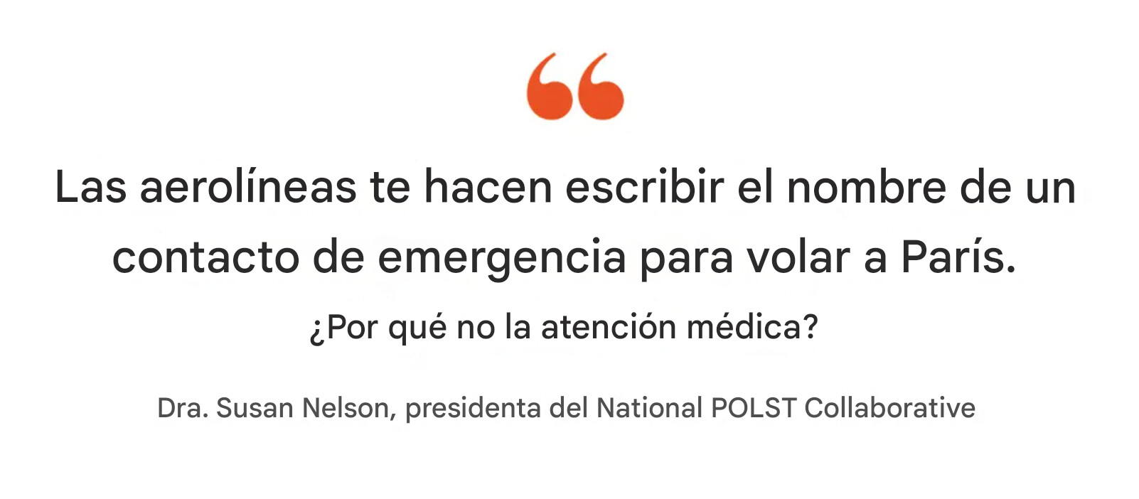 Los formularios POLST o MOLST, abreviatura de Órdenes Médicas para Tratamientos que Prolongan la Vida, existen para ese momento. La Colaboración Nacional POLST afirma que estos formularios están pensados para pacientes con enfermedades graves o frágiles que enfrentan decisiones inminentes. Son vinculantes en todos los ámbitos, desde ambulancias hasta servicios de urgencias, residencias.