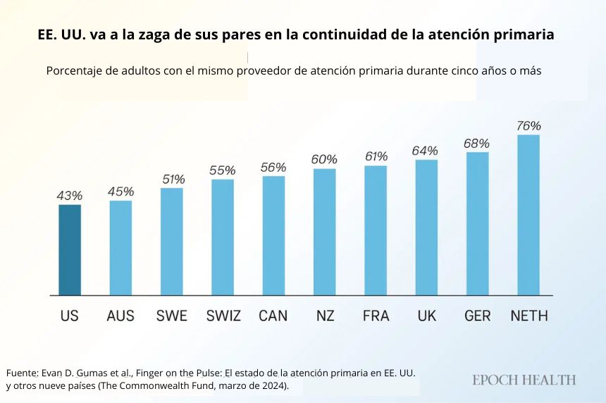 Menos de la mitad de los adultos estadounidenses informan haber tenido el mismo proveedor de atención primaria durante cinco años o más, por debajo de la mayoría de los países similares. (The Epoch Times)Habilidades perdidas que antes eran fundamentales en la atención médica