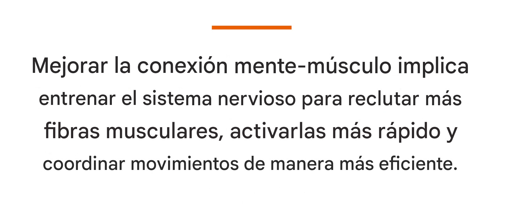 Mejorar la conexión mente-músculo implica entrenar el sistema nervioso para reclutar más fibras musculares, activarlas más rápido y coordinar movimientos de manera más eficiente.Tener una rutina previa al ejercicio puede ayudar al cerebro a asociar ciertas acciones con la actividad física, preparando al sistema nervioso para rendir al máximo. Por ejemplo, un corredor que se siente cansado antes de correr podría sentirse repentinamente con más energía con solo ponerse sus tenis deportivos.