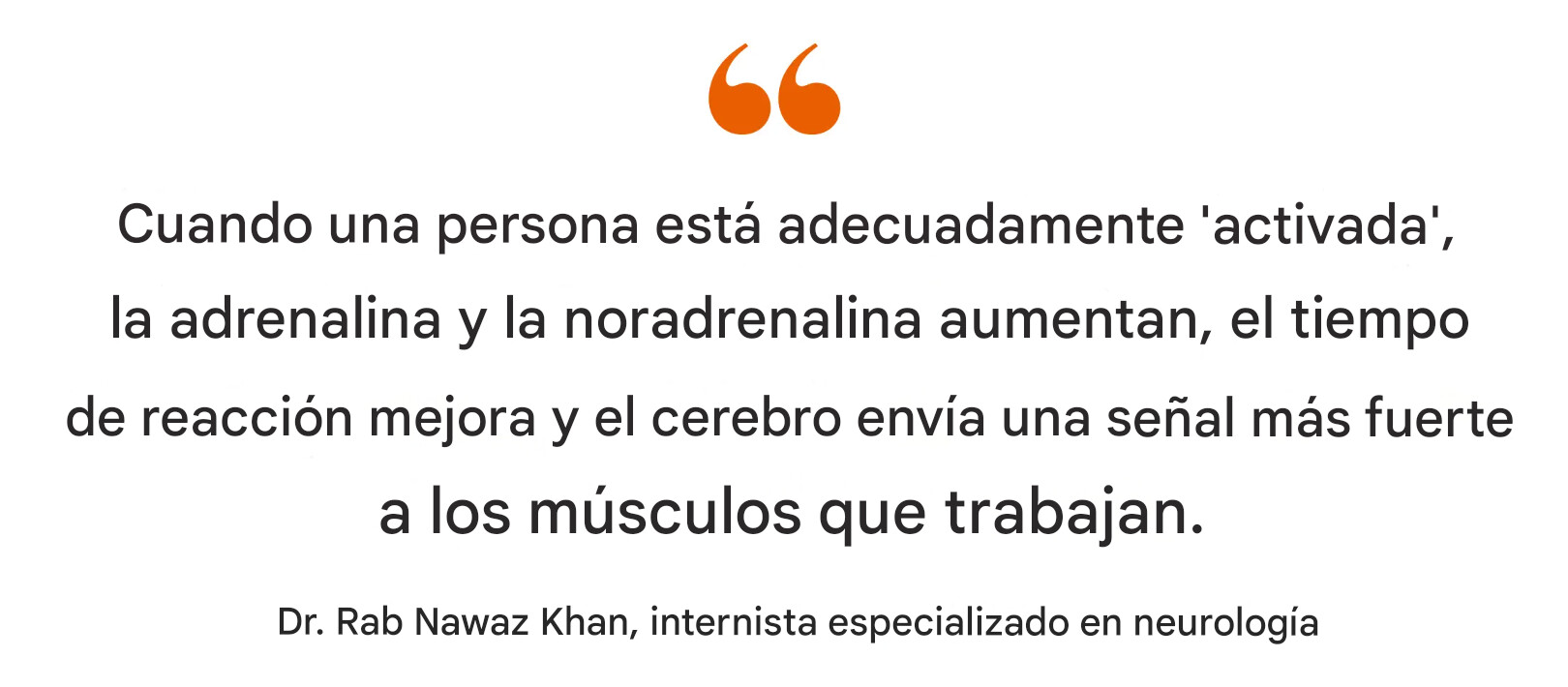 Canalizar las emociones y un diálogo interno centrado puede intensificar el esfuerzo y mejorar el rendimiento. (Imagen de Guido Mieth/Getty Images)Cuando una persona se encuentra adecuadamente "activa", la adrenalina y la noradrenalina aumentan, el tiempo de reacción mejora y el cerebro envía una señal más fuerte a los músculos activos, según explicó a The Epoch Times el Dr. Rab Nawaz Khan, internista especializado en neurología en el Reino Unido. Esto también centra la atención y reduce la percepción del esfuerzo durante un breve periodo, lo que permite a la persona concentrarse plenamente en el movimiento.