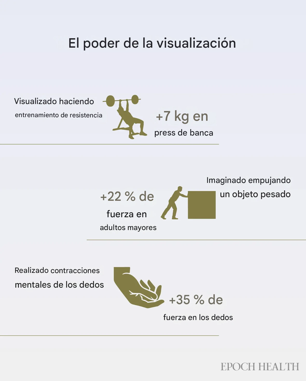 Estudios han demostrado que las personas pueden aumentar la fuerza muscular mediante técnicas de visualización específicas. (Ilustración de The Epoch Times, Shutterstock).La repetición mental activa muchas de las mismas redes cerebrales que se utilizan para el movimiento real, incluyendo las áreas de planificación motora y la corteza motora primaria, afirmó Khan. Repetir esta activación puede mejorar la capacidad del cerebro para enviar una señal clara y potente por la vía motora, incluso sin crecimiento muscular.