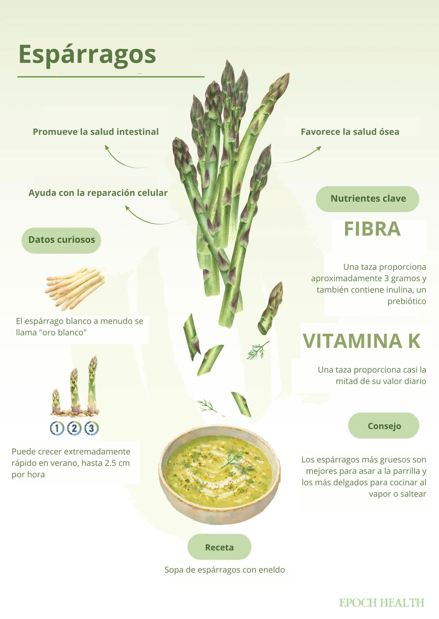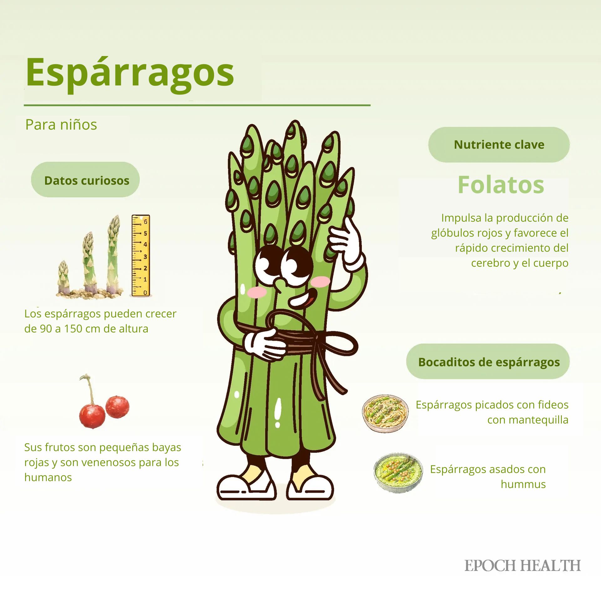 (Ilustración de The Epochtimes, Shutterstock)Para aprovechar estos beneficios y hacer que los espárragos resulten más divertidos para los niños, déjales que ayuden con la preparación partiendo los tallos por su punto natural de rotura. Ponerles nombres como "espadas de espárragos", "varitas mágicas verdes" o "arbolitos" puede hacer que la actividad resulte más lúdica.