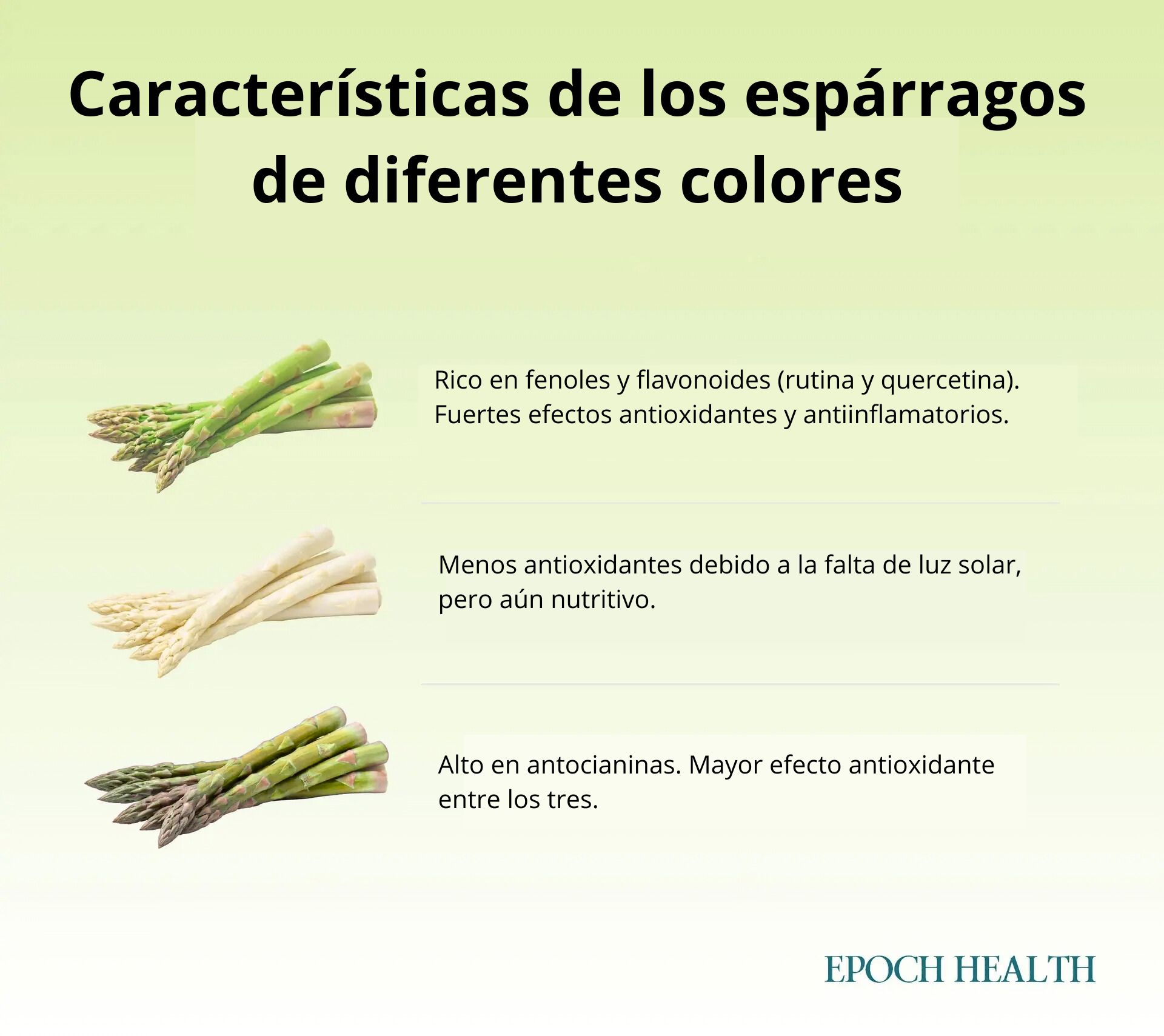 "Los espárragos blancos se cultivan sin luz solar, por lo que tienen un sabor más suave y contienen algo menos de antioxidantes; sin embargo, siguen siendo nutritivos", explicó Heba Abdelnabi, dietista titulada de Northwell Health Physician Partners, a The Epoch Times en un correo electrónico.