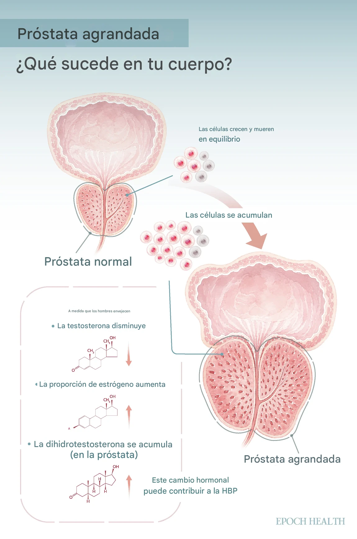 Los hombres producen naturalmente testosterona, la principal hormona sexual masculina, junto con pequeñas cantidades de estrógeno, la principal hormona sexual femenina. Una teoría propone que, con la edad, los niveles de testosterona activa disminuyen, lo que conlleva una mayor proporción de estrógeno. Este cambio hormonal podría contribuir al desarrollo de la hiperplasia prostática benigna (HPB), ya que el aumento de la actividad estrogénica en la próstata puede estimular el crecimiento celular y el agrandamiento de la misma.