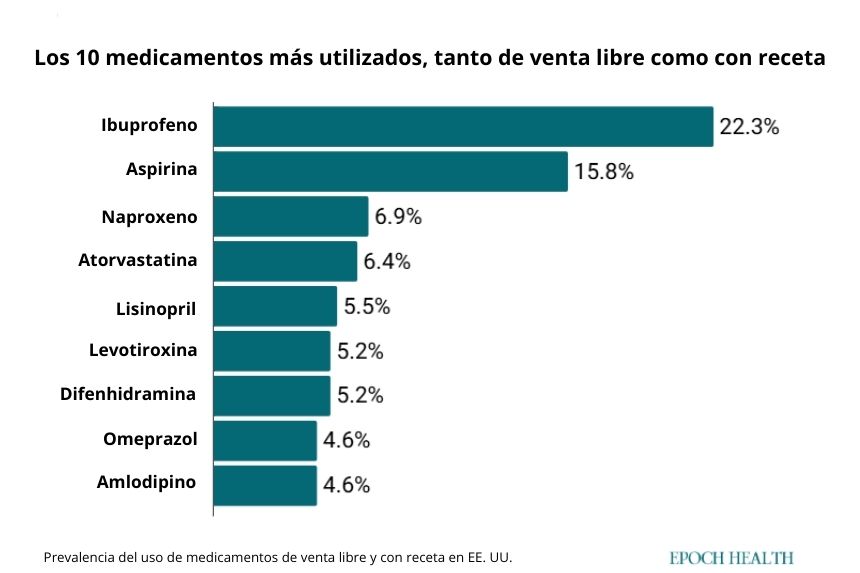 Los 10 medicamentos más consumidos identificados por los investigadores ofrecen una instantánea de los problemas de salud más comunes entre los estadounidenses.Según los datos del estudio, los cuatro medicamentos que ocupan los primeros puestos son el paracetamol, el ibuprofeno, la aspirina y el naproxeno, todos ellos antiinflamatorios de venta libre que ayudan a tratar la fiebre y el dolor moderado.