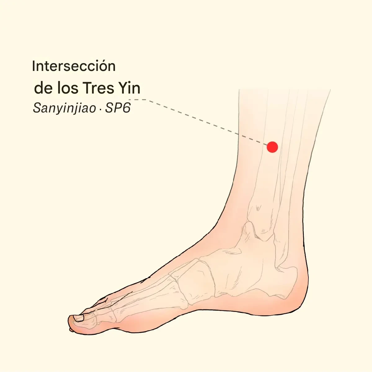 Además de los ajustes en la alimentación, se recomienda fortalecer la capacidad de autorregulación del cuerpo mediante masajes en puntos de acupuntura. Los dos puntos de acupuntura más utilizados son Sanyinjiao (SP6 o B6) y Gongsun (SP4 o B4).1. Sanyinjiao (SP6 o B6): Ubicado en el lado interno de la parte inferior de la pierna, aproximadamente cuatro dedos por encima del maléolo medial (la proyección en forma de perilla en el lado interno del tobillo), en una pequeña depresión que se siente al presionar.