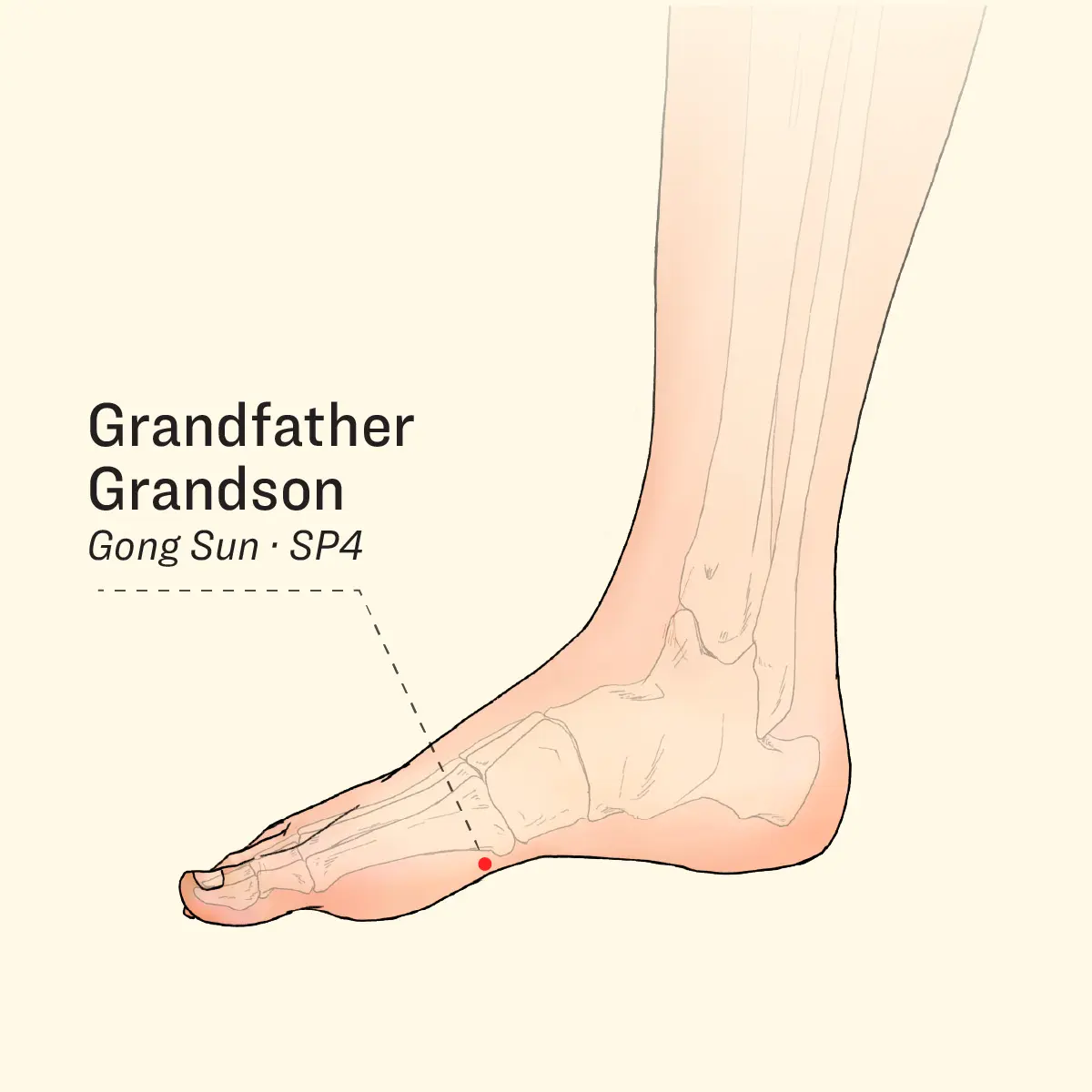 2. Gong Sun (SP4 o B4): Ubicado en la cara interna del pie. Primero, localice la depresión detrás de la articulación del dedo gordo, luego recorra el borde interno del pie y retroceda aproximadamente el ancho de un pulgar; se encuentra en la depresión justo debajo de los huesos metatarsianos.