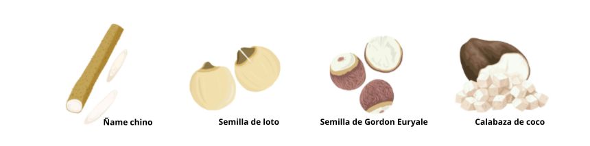 La sopa de cuatro hierbas se compone de cuatro ingredientes de terapia alimentaria con valor medicinal y nutricional: ñame chino (Huai Shan), semillas de loto, semillas de Euryale gordoniana (Qian Shi) y hongo Poria (Fu Ling). Los cuatro son de naturaleza neutra y sabor dulce, y ayudan a fortalecer el bazo.