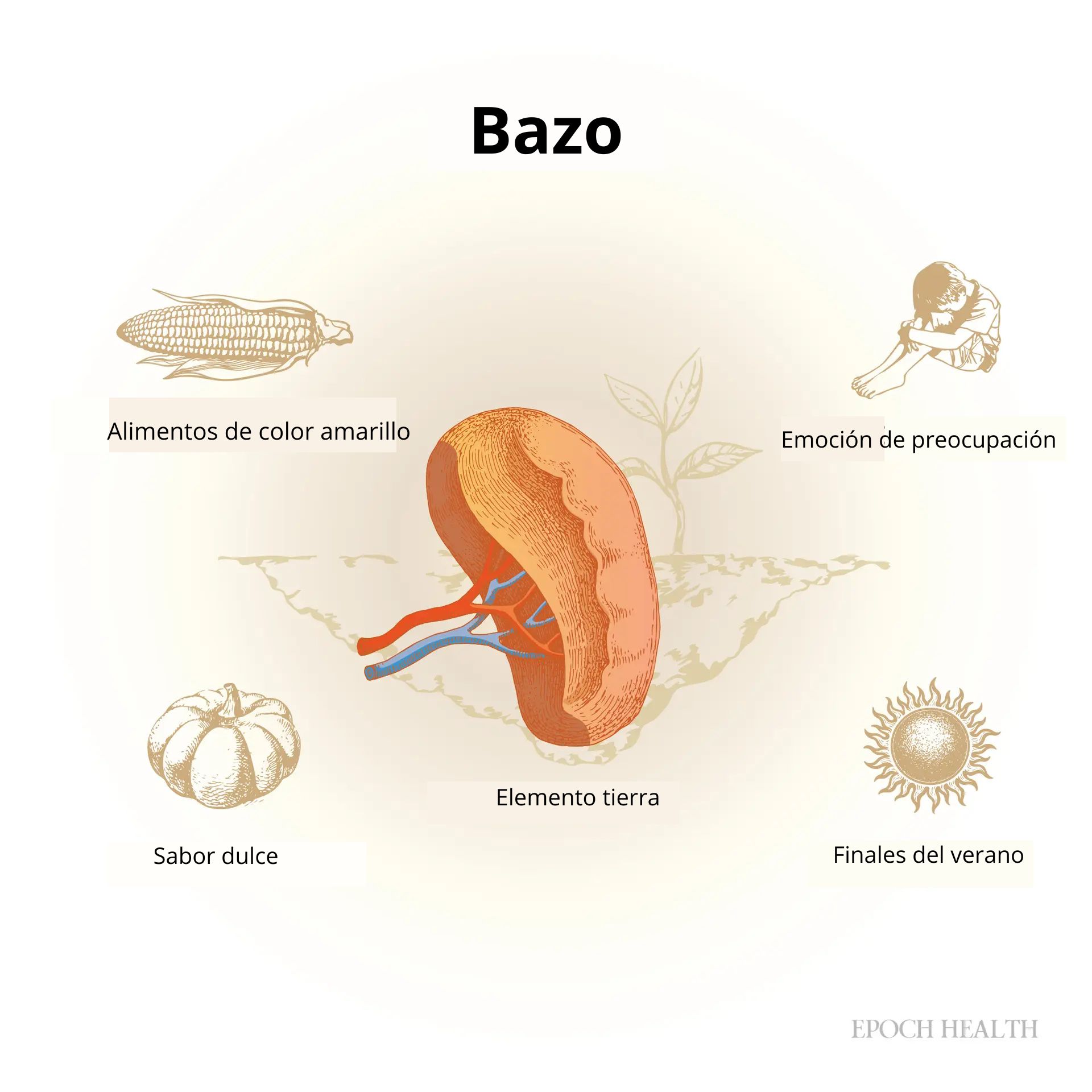 En la medicina tradicional china, el bazo se asocia con el elemento "tierra" dentro del marco de los cinco elementos: madera, fuego, tierra, metal y agua. Al igual que la tierra fértil produce cosechas abundantes, la función principal del bazo es transformar y transportar los nutrientes de los alimentos y los líquidos, proporcionando al cuerpo el sustento vital.