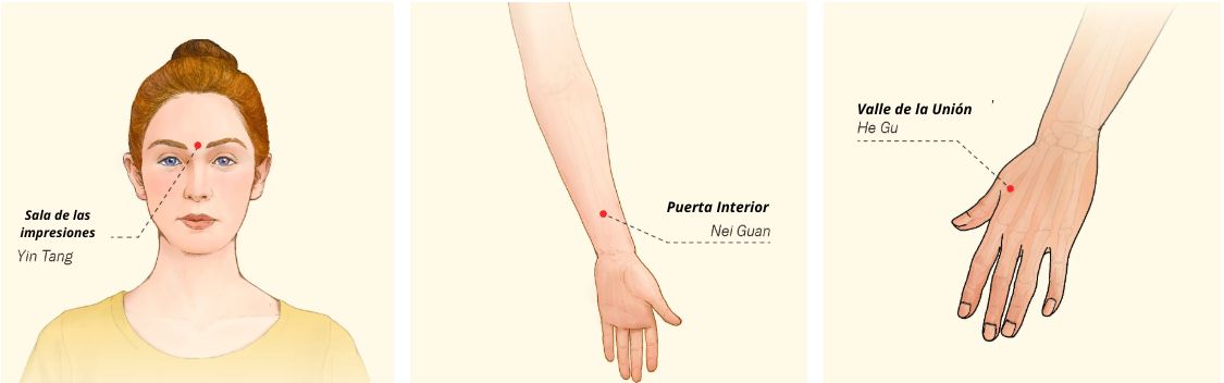 Puedes incorporar un sencillo masaje de puntos de acupuntura a tu rutina de autocuidado personal.Al masajear los puntos de acupuntura, es normal sentir sensaciones leves, como molestias, pesadez o una ligera presión. Sin embargo, si la presión resulta incómoda o dolorosa, reduce la intensidad o detente, ya que la acupresión debe ayudar al cuerpo a relajarse, no a crear tensión adicional. Evita aplicar presión en zonas con hematomas, hinchazón, inflamación o varices, ya que estas zonas son más vulnerables y pueden empeorar con la estimulación.