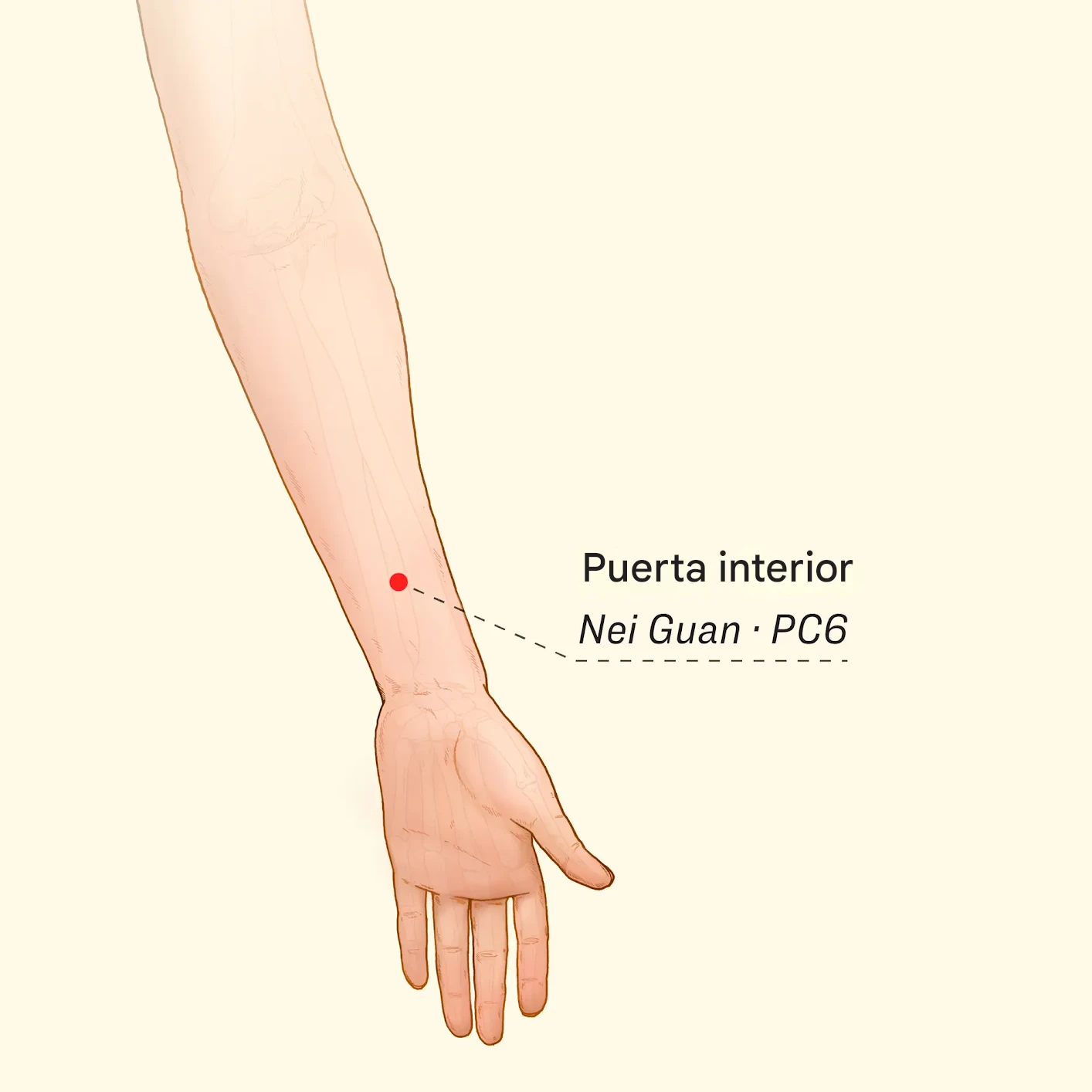 The Epoch TimesNei Guan (PC6): Ubicado en la parte interna del antebrazo, aproximadamente tres dedos por encima del punto medio del pliegue de la muñeca.