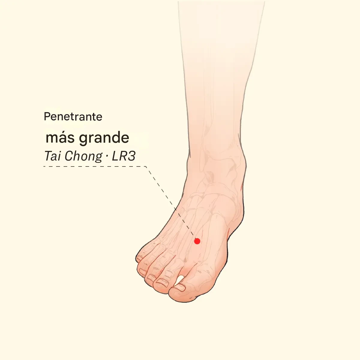 The Epoch TimesTai Chong (LR3): Ubicado en el dorso del pie, en la depresión entre el primer y segundo dedo, aproximadamente a un ancho de pulgar por encima del espacio interdigital, justo proximal a la unión del primer y segundo hueso metatarsiano.