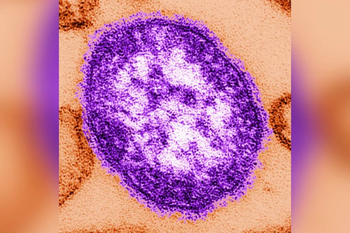 Esta imagen sin fecha, proporcionada por los Centros para el Control y la Prevención de Enfermedades el 4 de febrero de 2015, muestra una imagen de microscopio electrónico de una partícula del virus del sarampión (centro). (The Canadian Press/AP-Cynthia Goldsmith/Centros para el Control y la Prevención de Enfermedades vía AP).Las infecciones se produjeron en diversos eventos, como competiciones de lucha libre, actividades de baile y baloncesto, según informaron las autoridades.