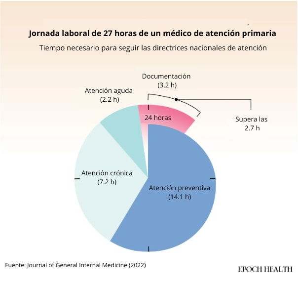 Según las directrices nacionales de atención médica, se necesitarían casi 27 horas diarias de un médico de atención primaria, más de lo que permite una jornada laboral completa. (The Epoch Times)Los pacientes notan la presión. Millones de personas salen de las consultas sin tener claro lo que les han dicho o qué pasos deben seguir a continuación. Un estudio de simulación de 2022 publicado en la revista *Journal of General Internal Medicine* estimó que, para prestar toda la atención preventiva, crónica y aguda recomendada en las guías a todos sus pacientes, un médico de atención primaria necesitaría 27 horas al día.
