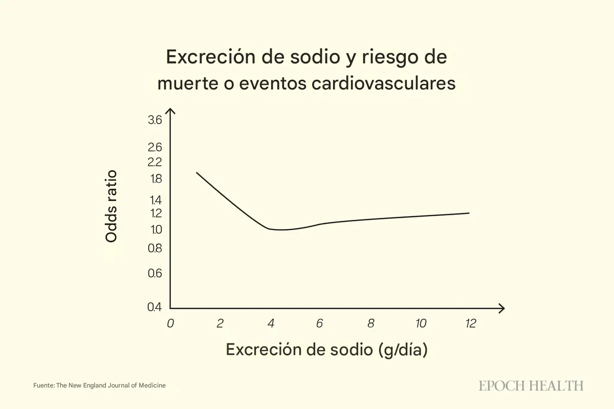 Los investigadores identificaron una curva de asociación en forma de J entre la excreción de sodio y el riesgo de muerte o eventos cardiovasculares. (The Epoch Times)La ingesta óptima de sal también puede variar según factores como la constitución, la actividad física, el clima y la salud general. Por ejemplo, las personas que sudan mucho, como deportistas, quienes realizan trabajos al aire libre o quienes viven en climas cálidos, podrían necesitar sal adicional para reponer el sodio perdido a través de la transpiración.