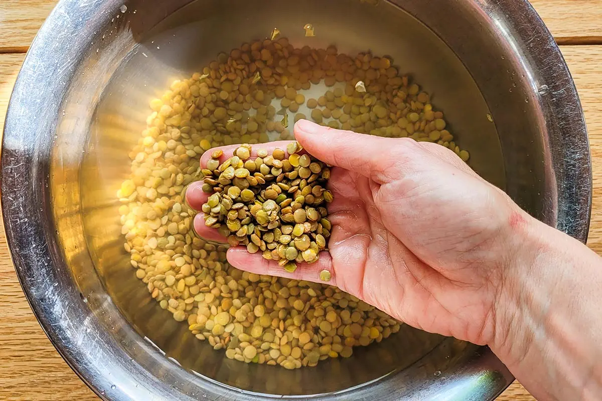 Paso 1: Añada la cantidad deseada de legumbres secas a un recipiente y cúbralo completamente con agua. Es preferible usar agua filtrada o destilada; evite el agua clorada.