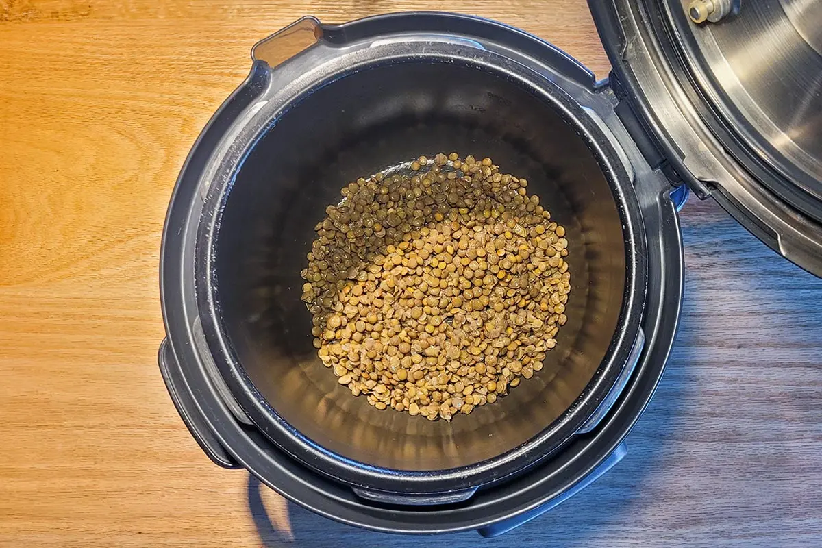 Paso 2: Añada las legumbres a una olla a presión con agua o caldo, utilizando una proporción de casi 1/2 kg de legumbres por cada 6 a 8 tazas de líquido.