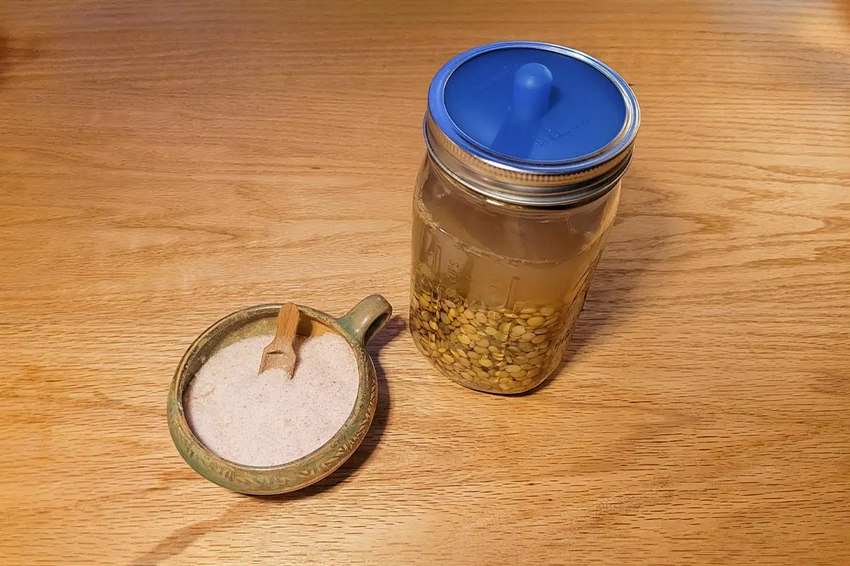 Paso 4: Transfiera las legumbres remojadas a un frasco y cúbralas completamente con la salmuera. Deje fermentar a temperatura ambiente de dos a cinco días. Si no usa una tapa de fermentación, asegúrese de liberar la presión del frasco periódicamente.