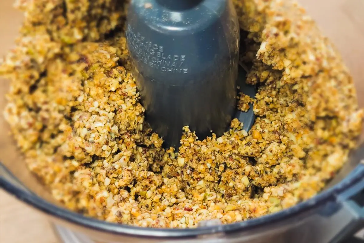 Paso 1: Combine nueces, semillas, frutas secas y mantequilla de nueces (y miel) en un procesador de alimentos con una pizca de sal y canela molida.