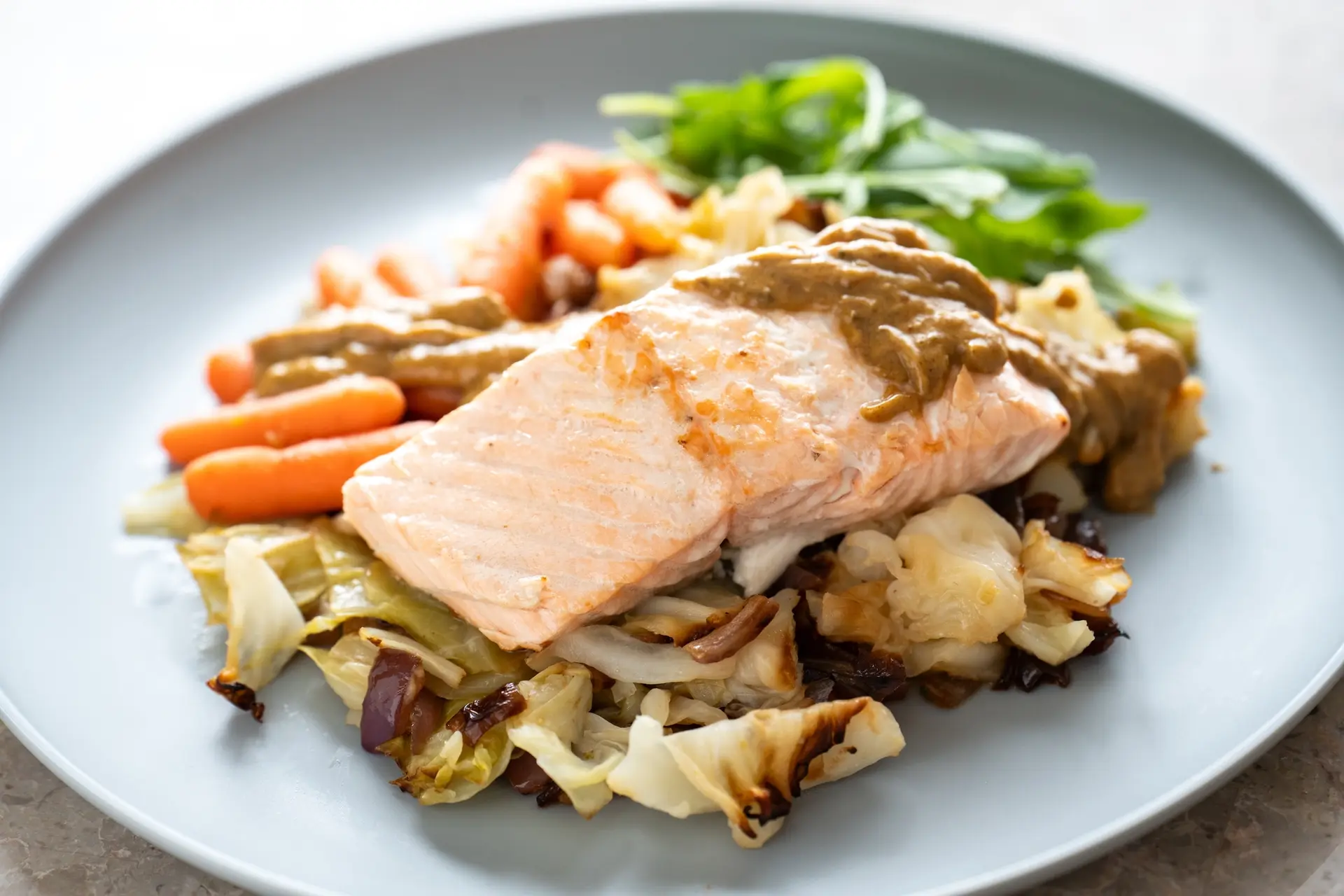 Cena: Salmón al horno con verduras asadas y aderezo de pesto de almendra
