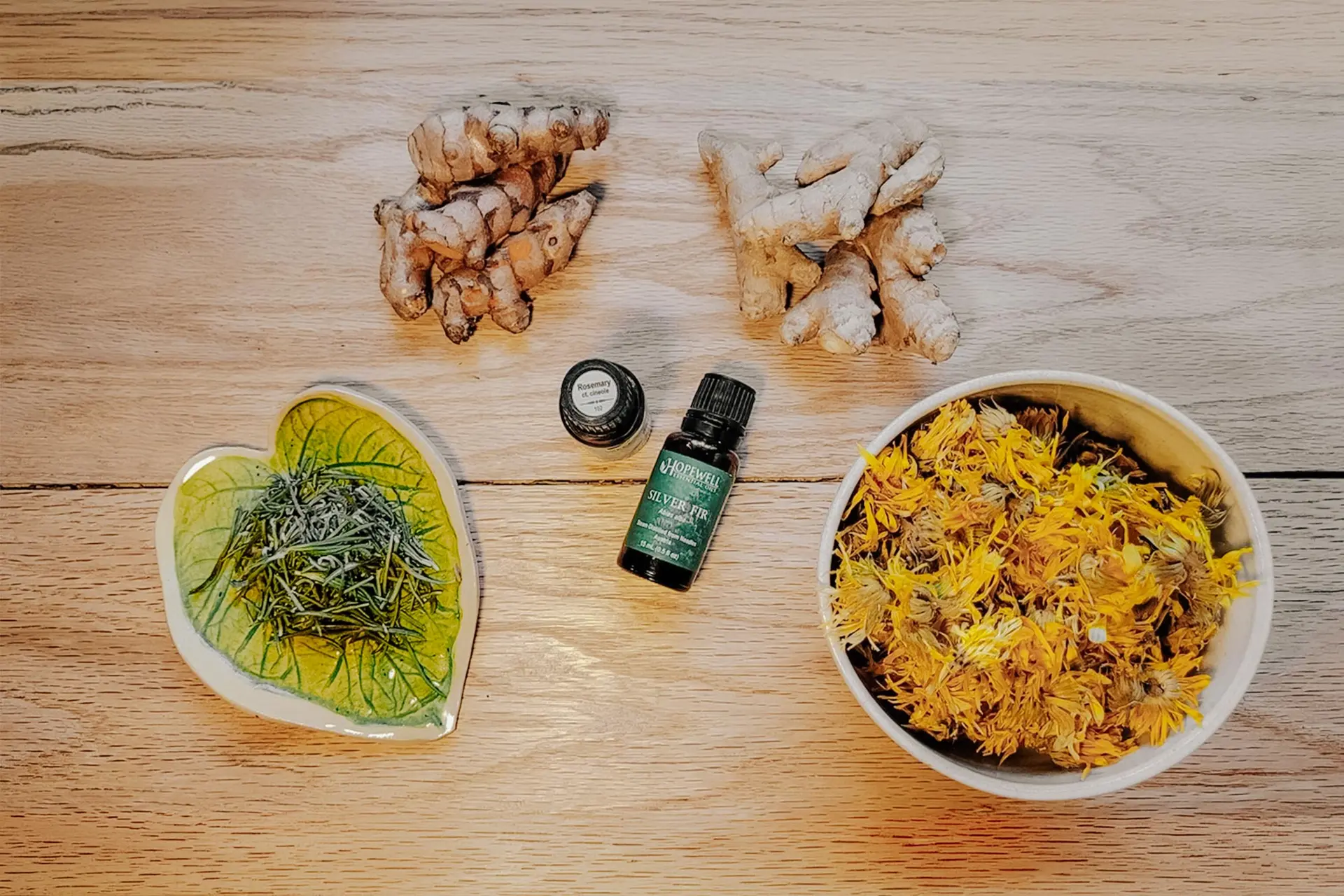 (Cortesía de Alexandra Roach)Paso 2: Lave las agujas de romero y abeto. Desmenúcelas ligeramente, ya sea cortándolas en trozos más pequeños o triturándolas con un mortero. Las flores de caléndula suelen comprarse secas y se reavivan en el agua.
