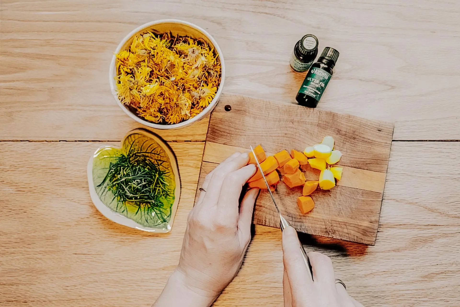 - De 5 a 7 flores enteras de caléndula, o su equivalente en pétalos de flores.