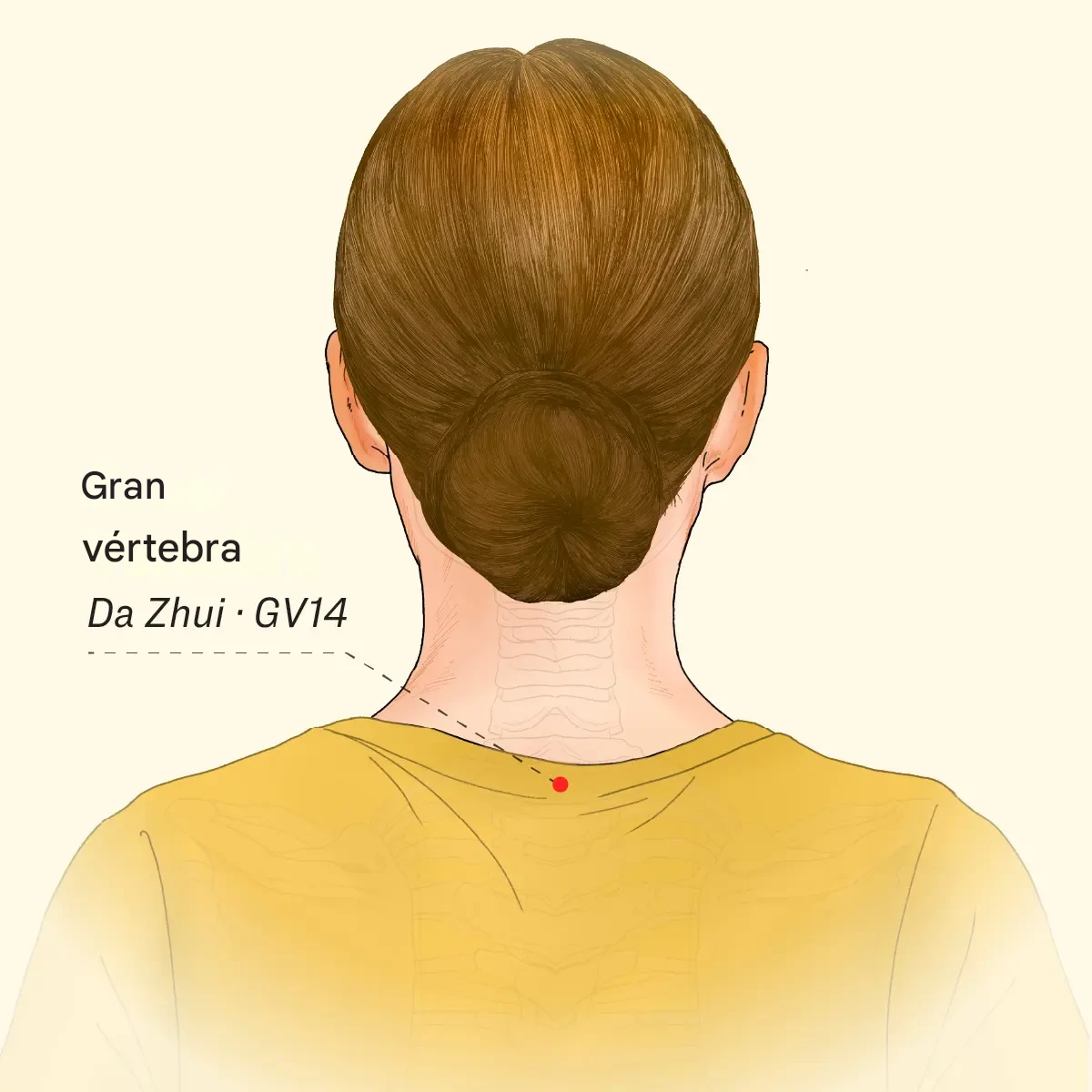Pasos:- Cruce las manos y colóquelas sobre el punto de acupuntura Da Zhui, el punto prominente donde se unen la columna cervical y torácica.