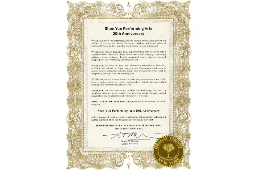 Funcionarios del estado de Nueva York enviaron proclamaciones y cartas dando la bienvenida al regreso de Shen Yun Performing Arts al Lincoln Center, del 25 de marzo al 12 de abril. Entre los funcionarios se encuentran el miembro de la Asamblea Estatal Karl A. Brabenec, la miembro de la Asamblea Estatal Paula Kay, el senador estatal James Skoufis, el ejecutivo del condado de Orange Steven M. Neuhaus y el fiscal del condado de Orange David M. Hoovler.