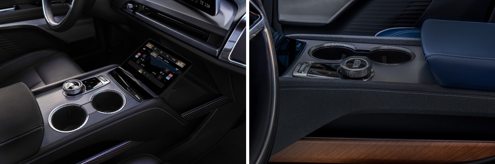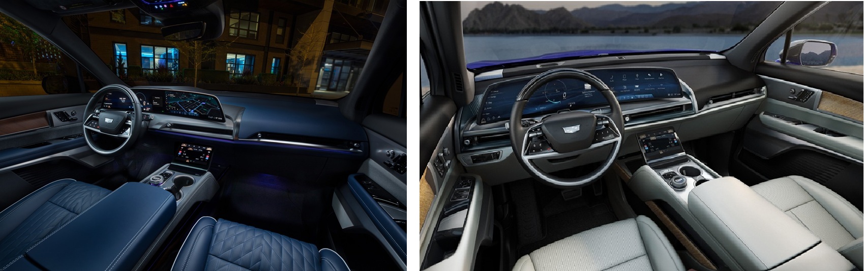 El salpicadero está equipado con la pantalla digital curva de 33 pulgadas (84 centímetros) que integra el panel de instrumentos y el sistema de información y entretenimiento, convirtiéndose en una constante de los modelos de Cadillac. En la consola central hay una pantalla táctil auxiliar para controlar la climatización y otras funciones, un mando para manejar a distancia el sistema de infoentretenimiento y una rueda de desplazamiento para ajustar el volumen.