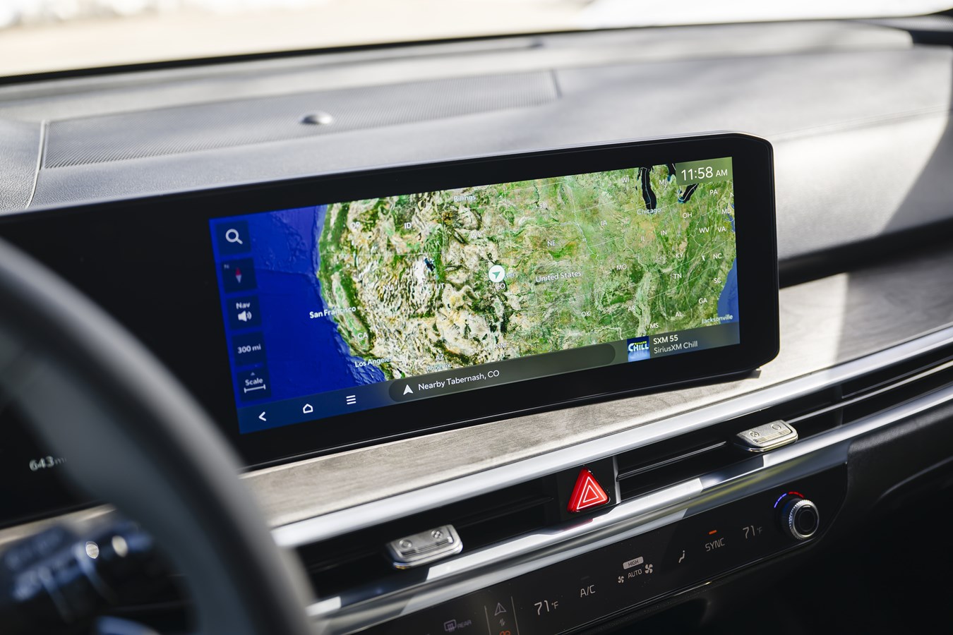 Nuestro Sorento X-Pro de prueba venía con una pantalla de visualización frontal de 10 pulgadas que puede proyectar indicaciones de navegación paso a paso desde aplicaciones de mapas en los teléfonos inteligentes y un espejo retrovisor digital.